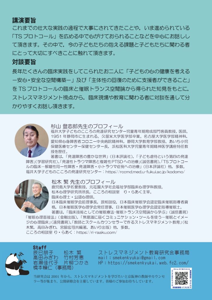 私も杉山登志郎先生との対談で招聘されて、「臨床を通してストレスマネジメント教育を考える-TSプロトコール&催眠トランス空間論からの学び」と題して対談することになりました。